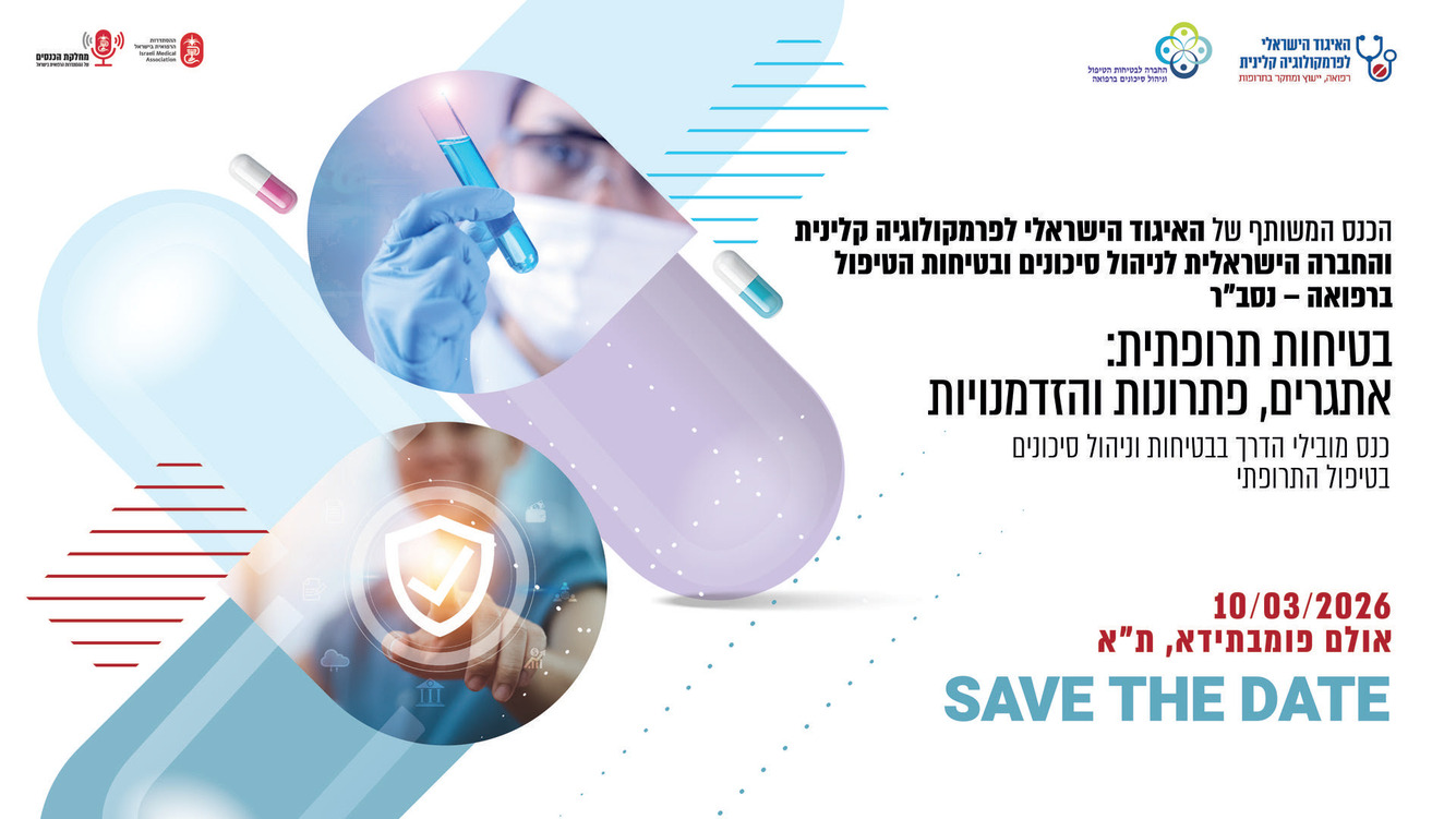 SAVE THE DATE - הכנס המשותף של האיגוד הישראלי לפרמקולוגיה קלינית והחברה הישראלית לניהול סיכונים ובטיחות הטיפול ברפואה. 10/3/26 אולם פומבדיתא, ת"א